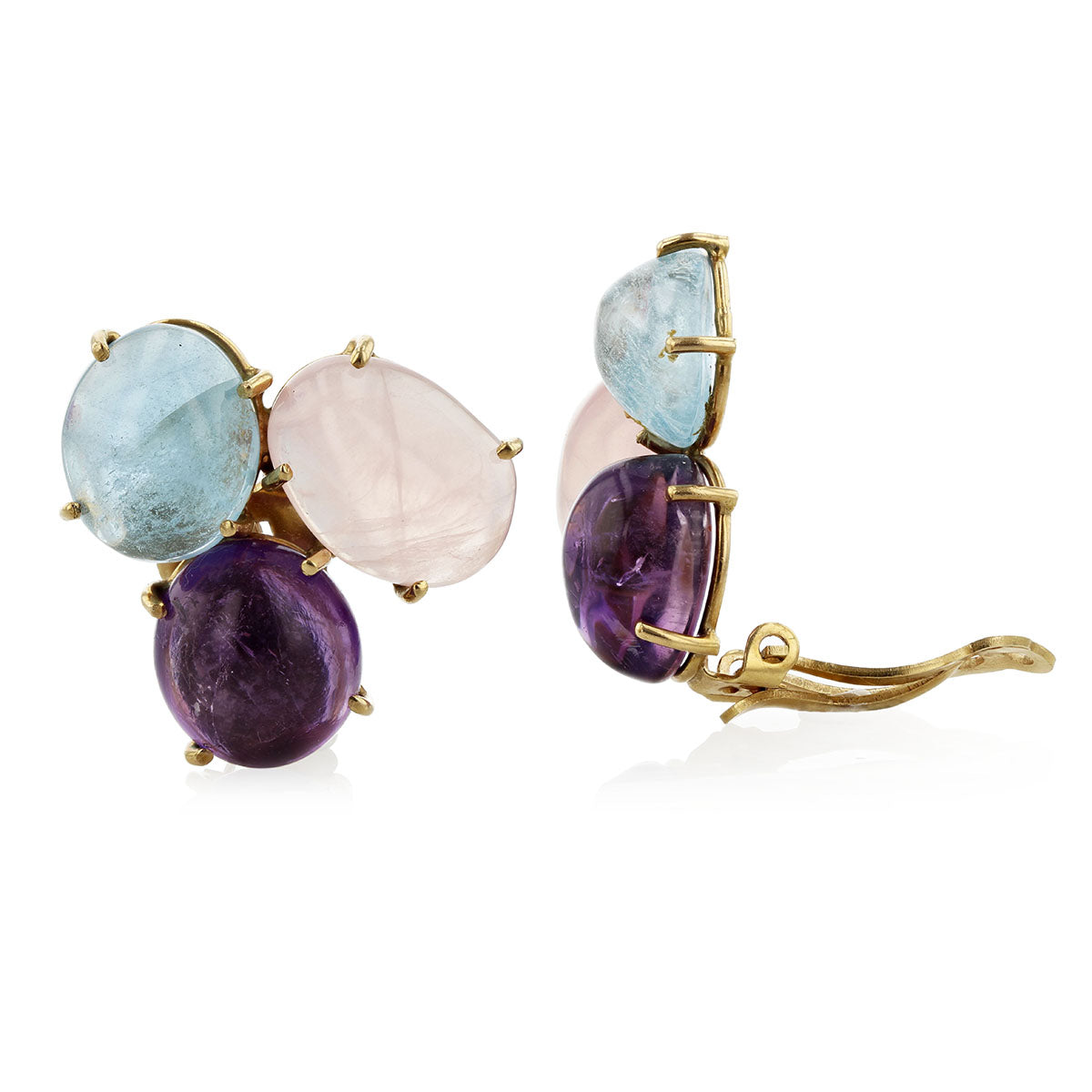 Cabochon Triangle Cluster Clipback Earrings with Amethyst, Rose Quartz, and Blue Tourmaline in 14K Gold