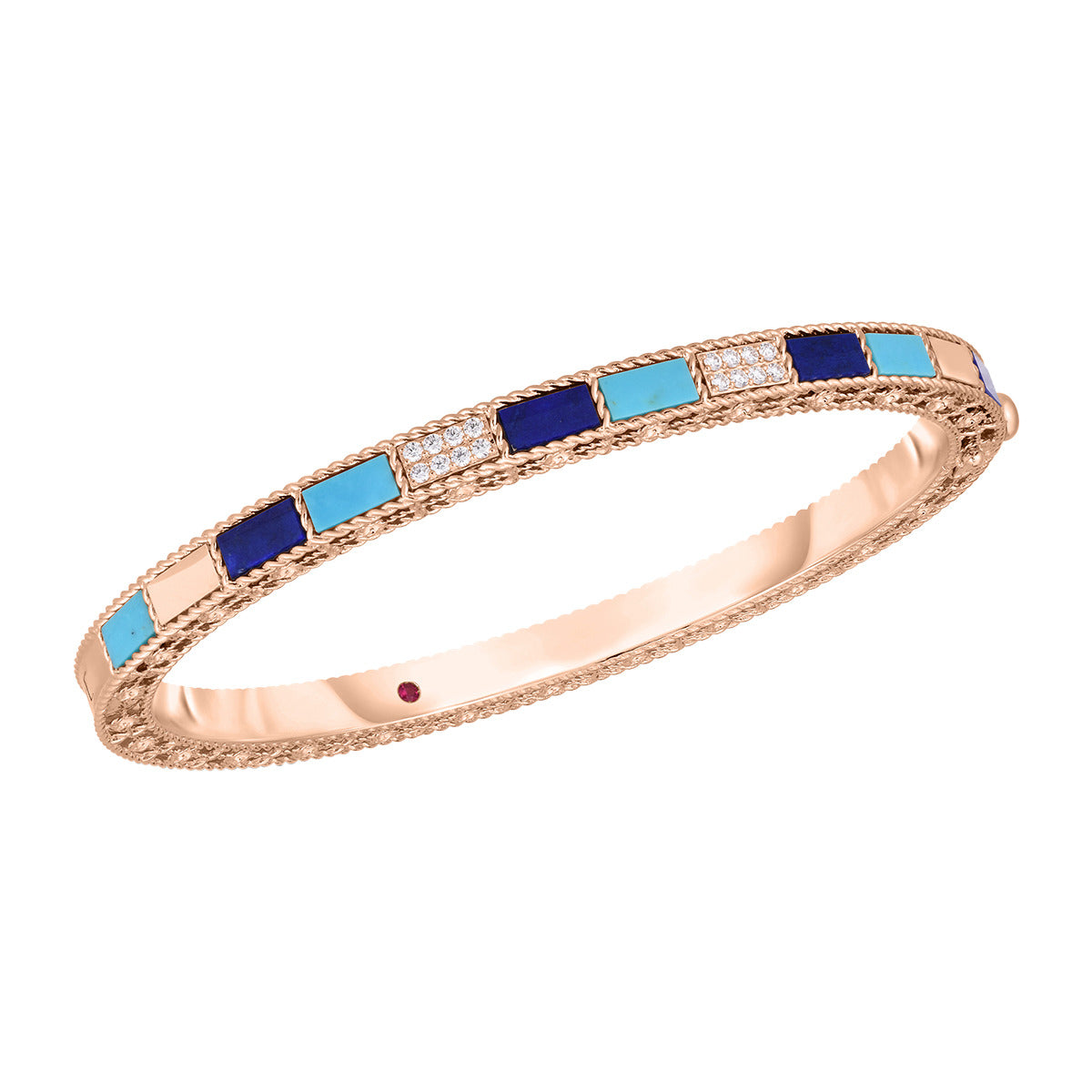 18K Rose Gold Mosaic Alternating Blue Lapis, Diamond and Turquoise Bangle