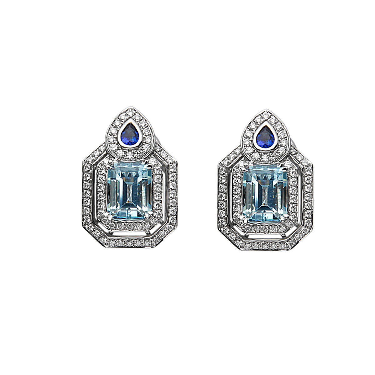 Aquamarine and Diamond Halo Earrings with Sapphires in 18K White Gold
