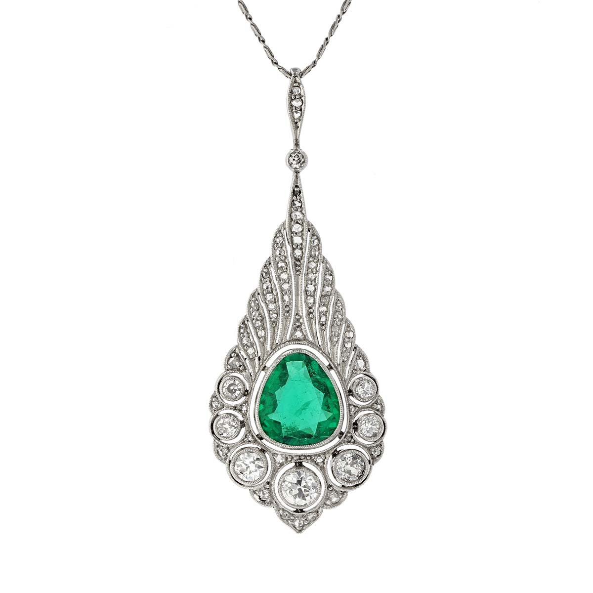 Art Deco Platinum Colombian Emerald and Diamond Pendant Necklace
