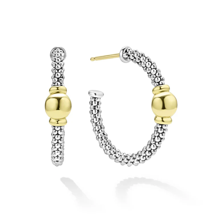 Upgrade your jewelry collection with these luxurious Caviar hoop earrings. Made with 25x5mm circle stations, these earrings are crafted from sterling silver and 18K yellow gold for a striking contrast.