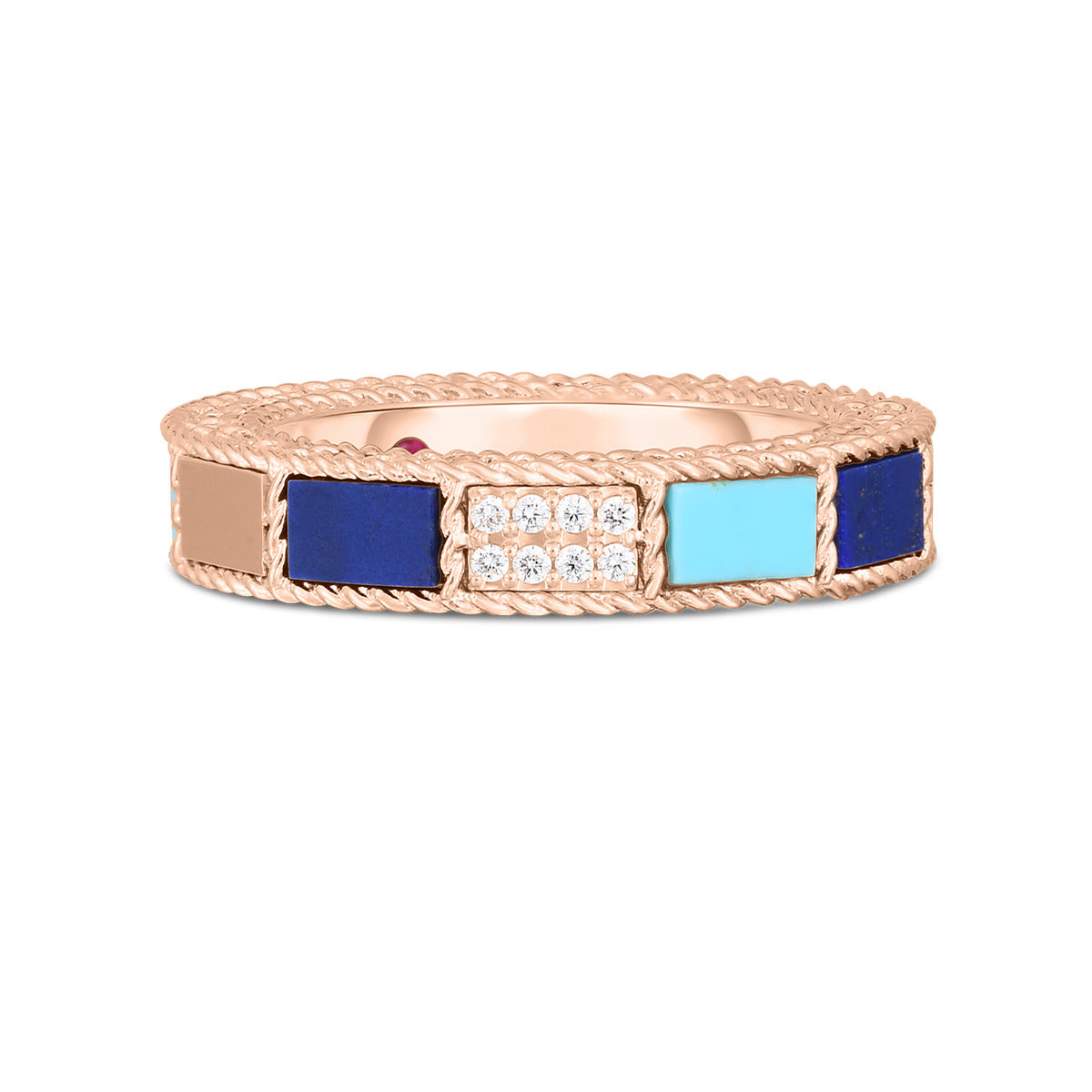 18K Rose Gold Mosaic Alternating Blue Lapis, Diamond and Turquoise Ring