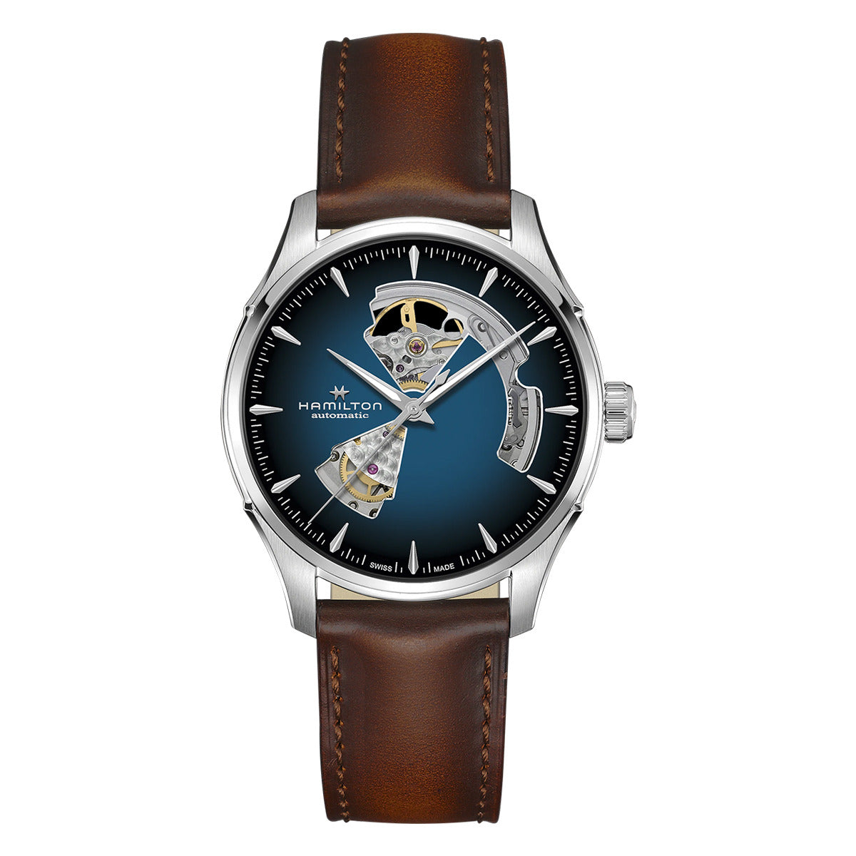 - The Jazzmaster collection features a 40mm stainless steel case, automatic movement, and smooth bezel. Its blue dial and strap complete the sleek aesthetic of model number H32675540.
