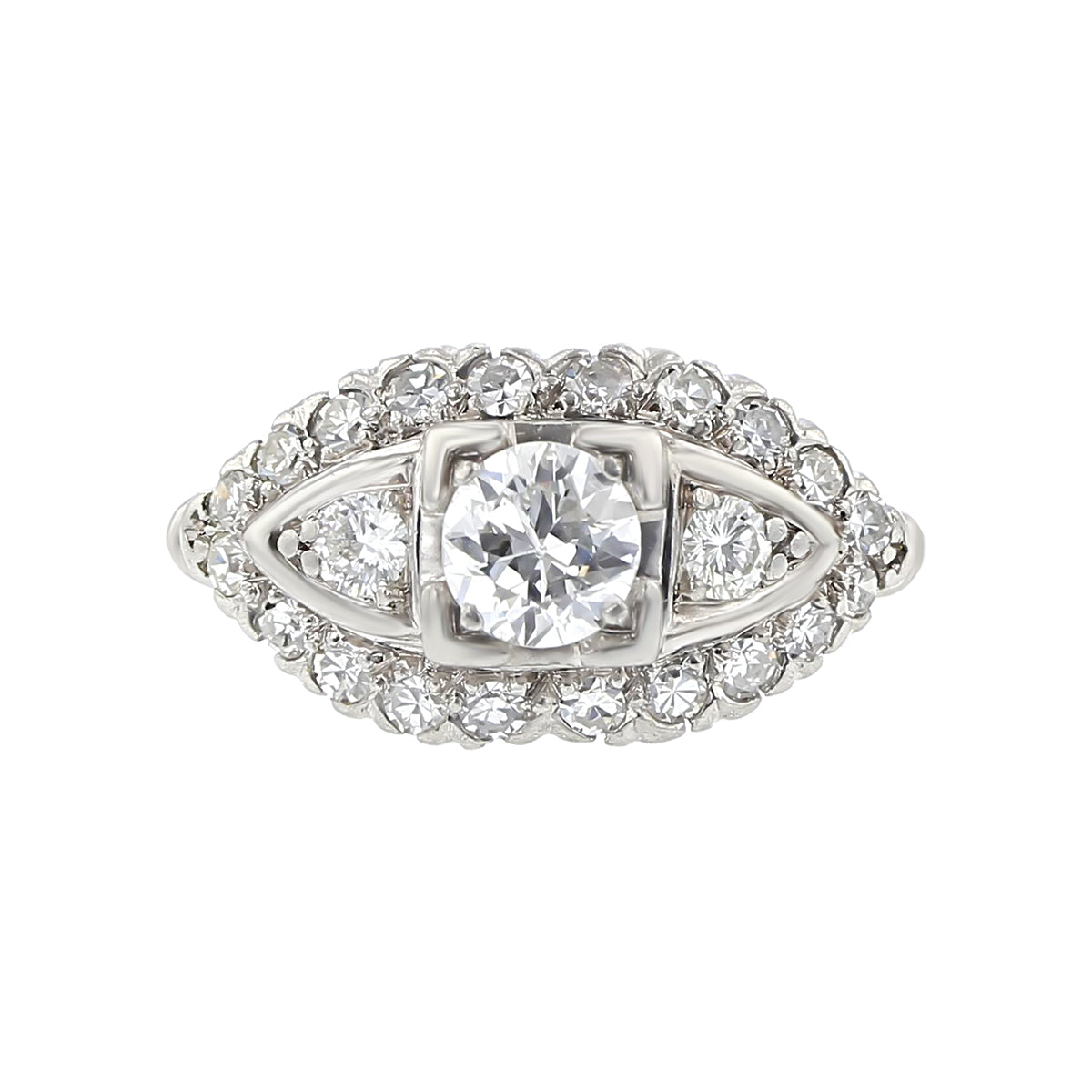 This exquisite Art Deco ring is expertly crafted in platinum, showcasing a stunning 0.48 carat round brilliant diamond with a clarity grade of SI1 and a color grade of H. Two additional round brilliant diamonds, totaling 0.18 carats, accent the center stone, while 20 smaller diamonds totaling 0.42 carats add an extra touch of sparkle. A truly elegant and timeless piece.