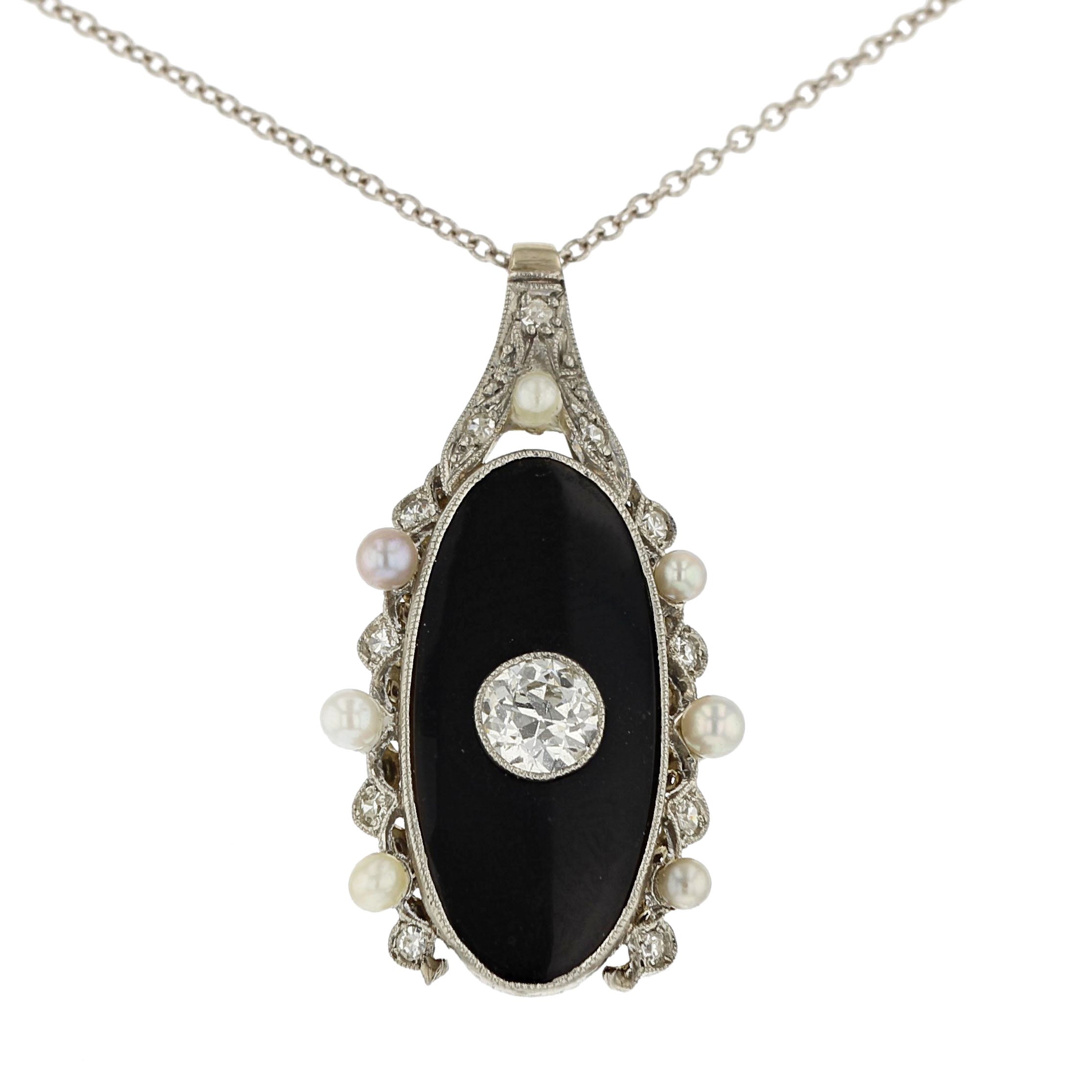 0.45ct Round Brilliant Diamond, 0.20ct Pearl Diamond, and Black Onyx Art Deco Pendant in Platinum on 14K 16" Chain