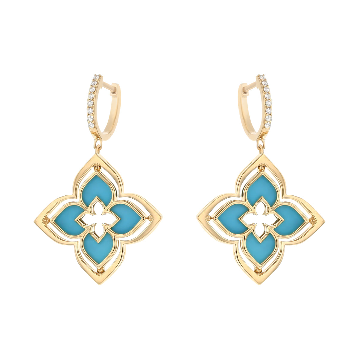 The Venetian Princess earrings feature a stunning combination of 0.19 carat diamonds and turquoise set in 18K yellow gold. This unique design adds a touch of elegance and sophistication to any outfit. Perfect for a special occasion or as a statement piece.