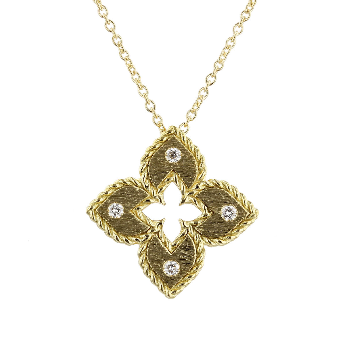 Expertly crafted and delicately designed, the Venetian Princess Flower pendant boasts a 0.02 carat diamond set in 18K yellow gold. Perfectly sized for everyday wear, this necklace comes with an 18 inch chain. Elevate your style with the timeless beauty and elegance of this piece.